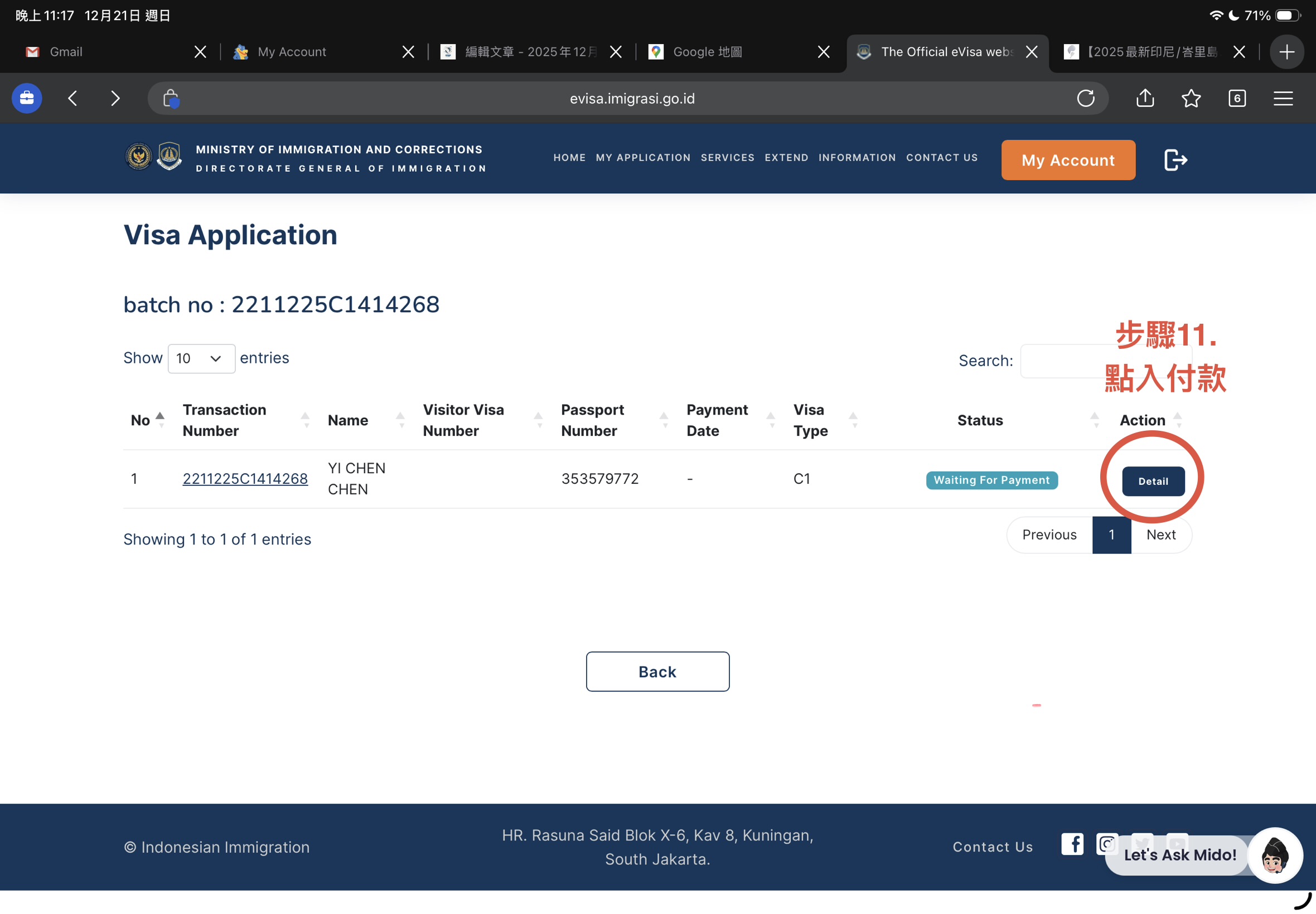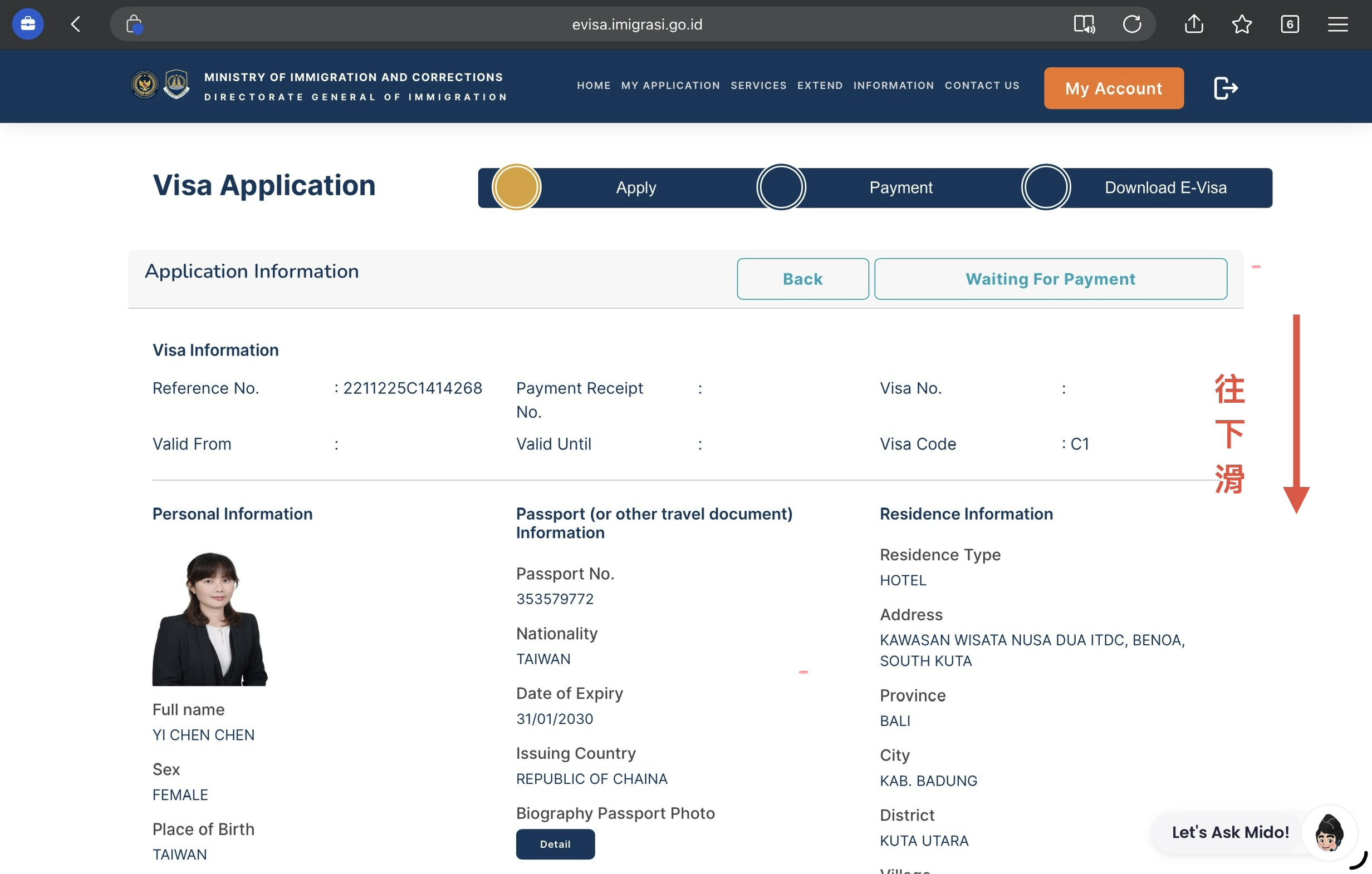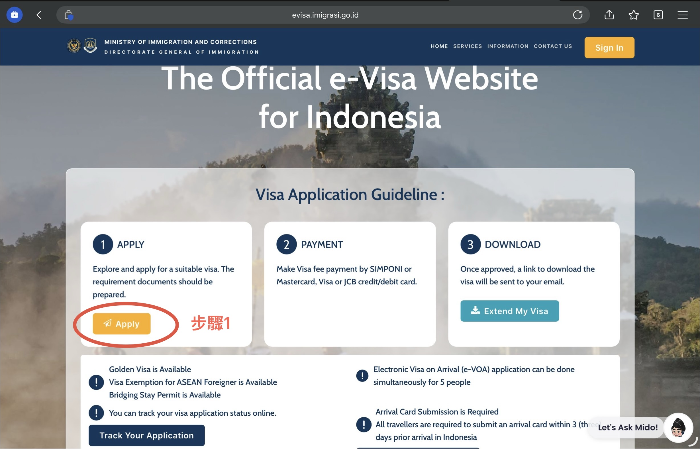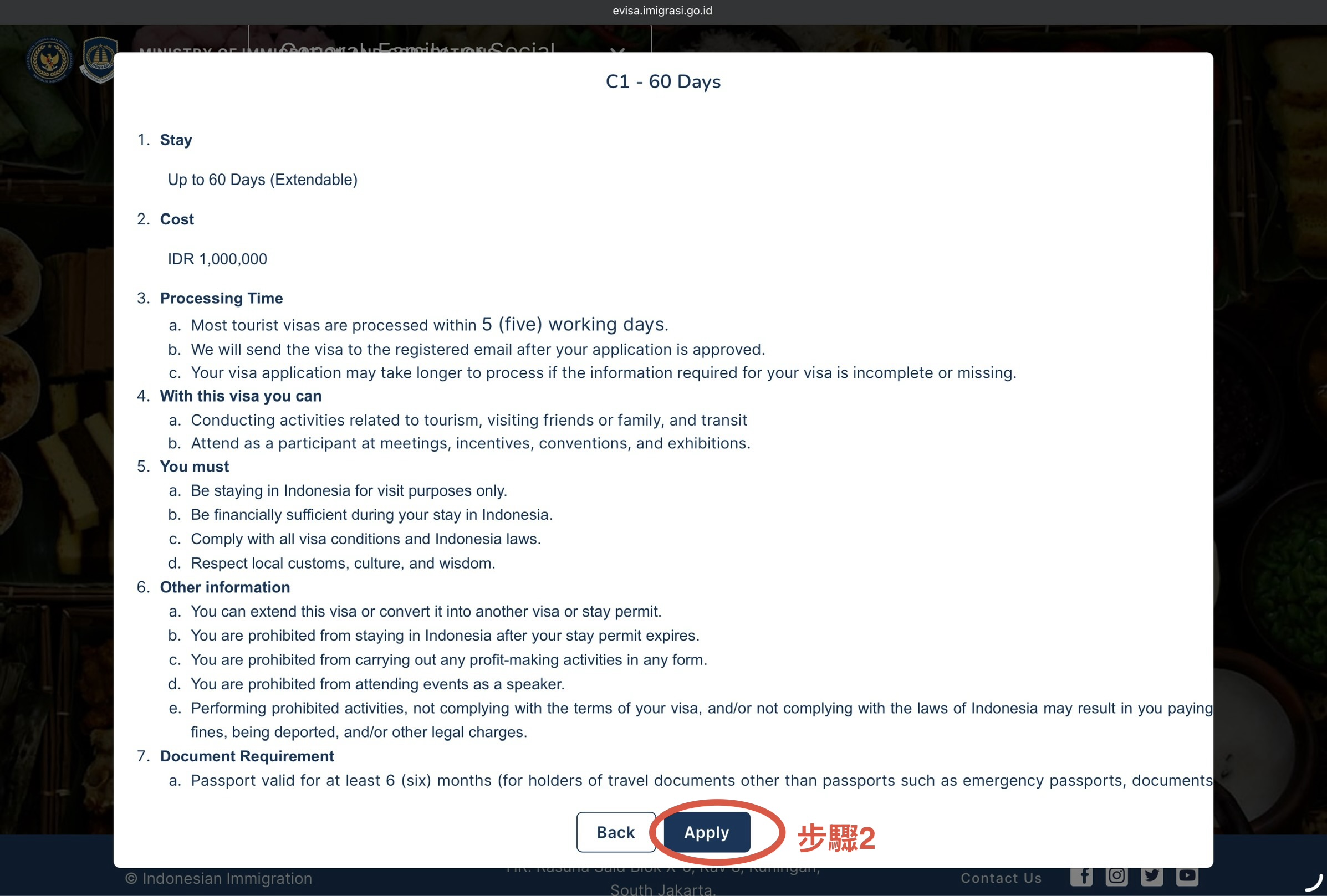 - 簽證費用 500,000 印尼盾 (線上刷卡)