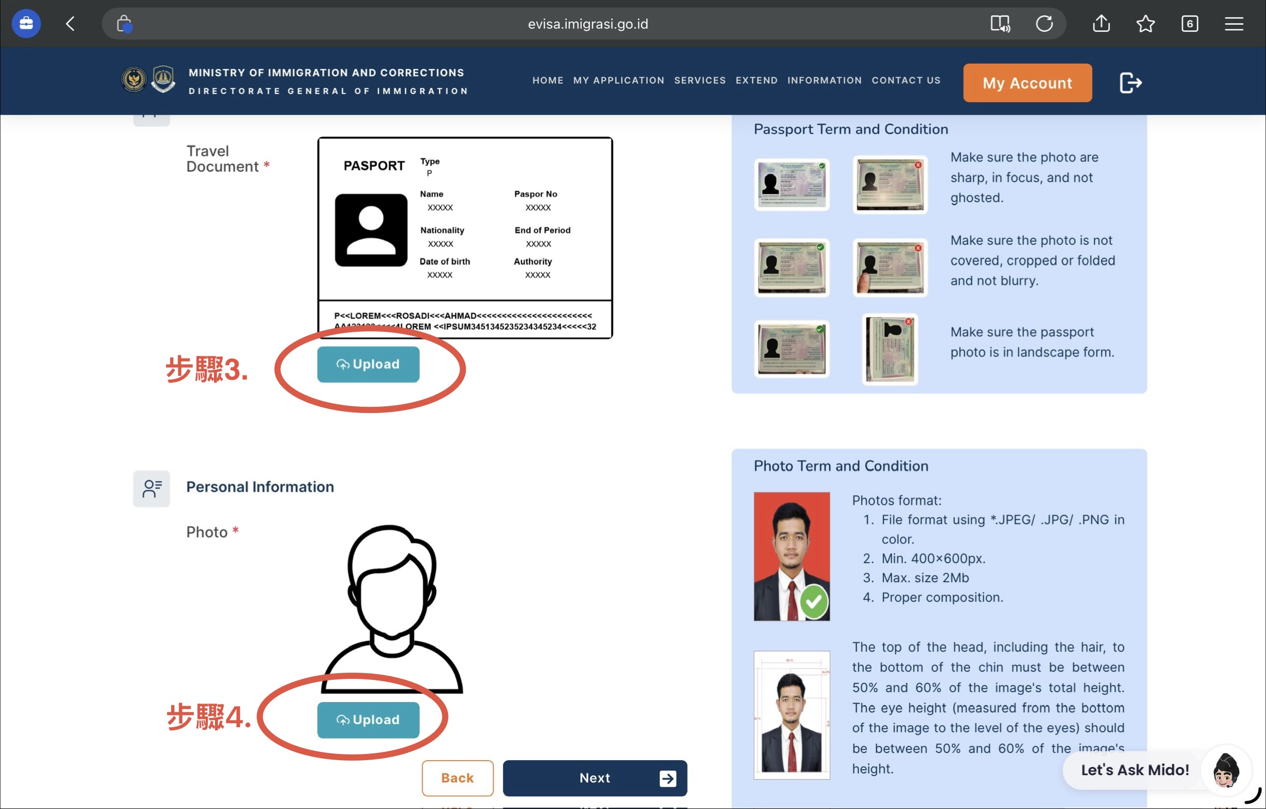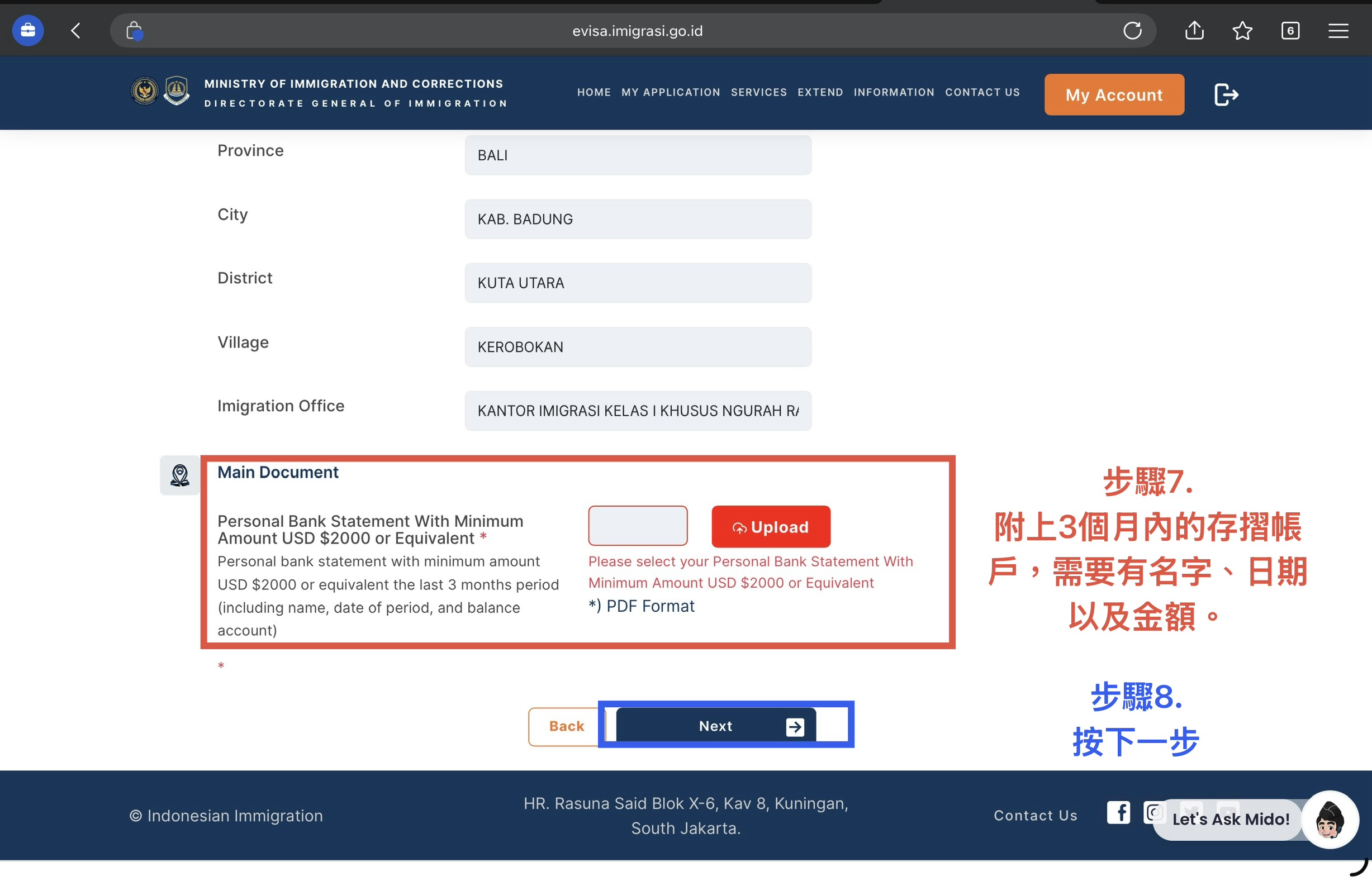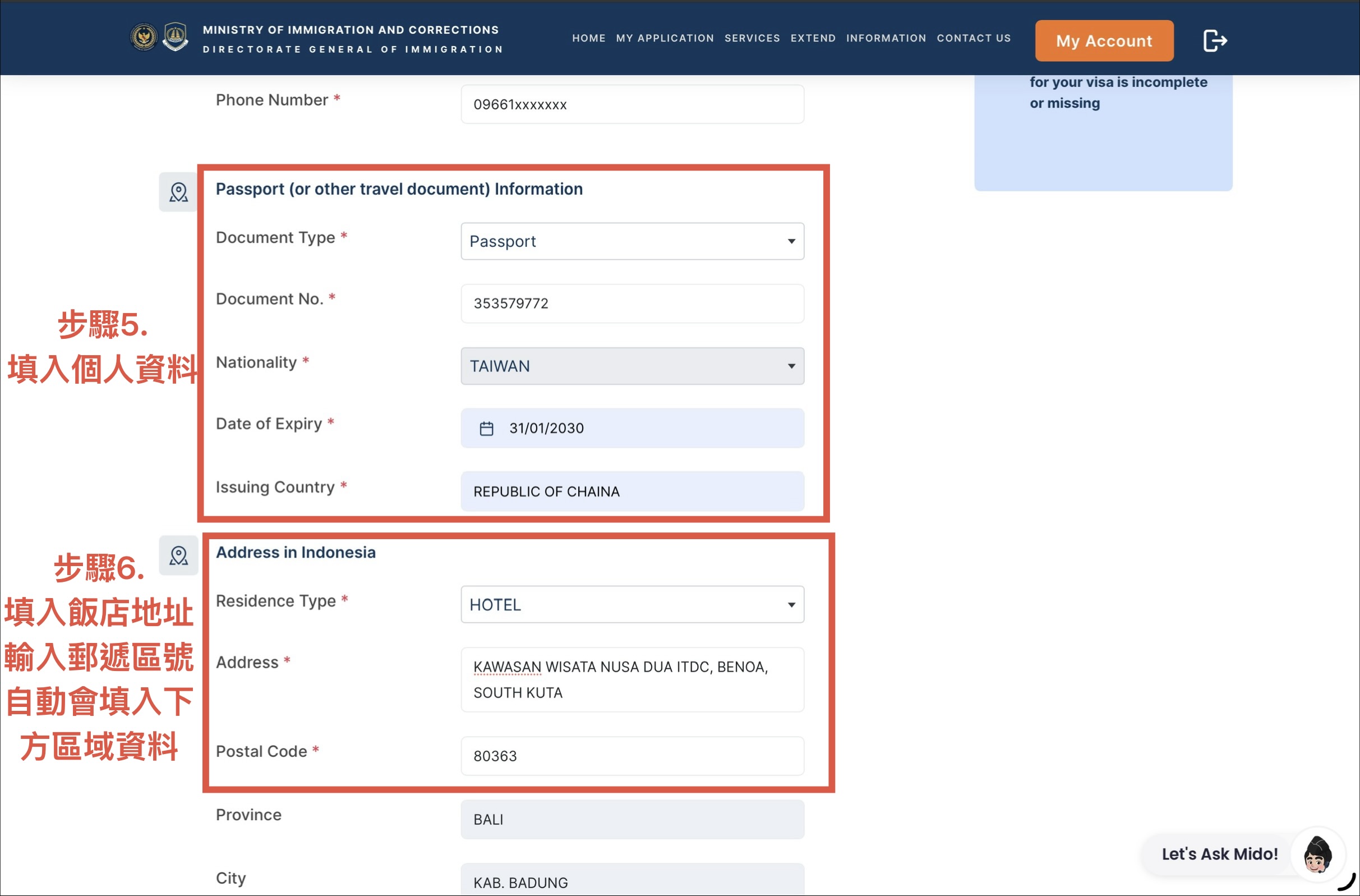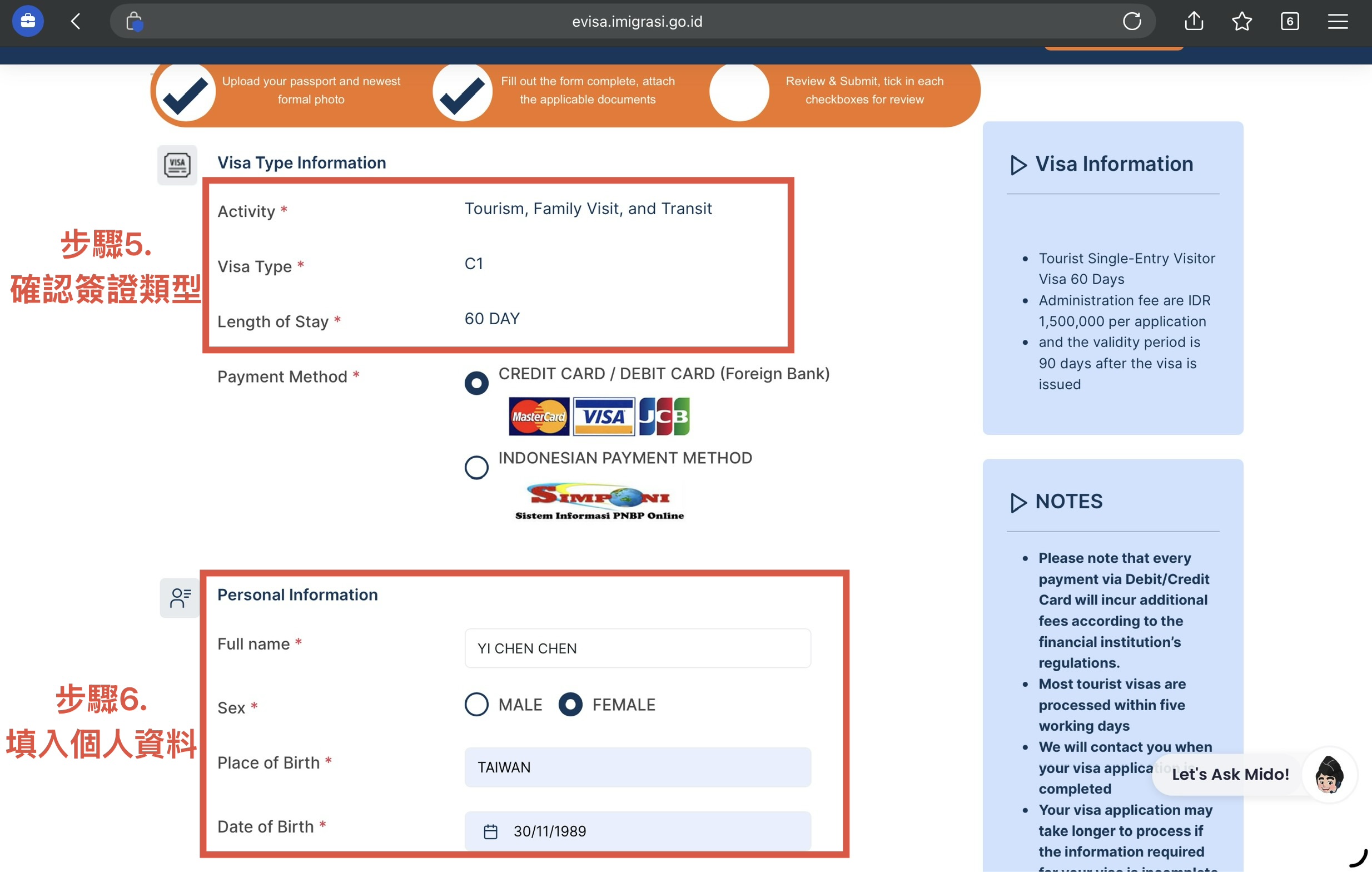 步驟 5-6:填寫個人資料以及印尼住宿資訊
