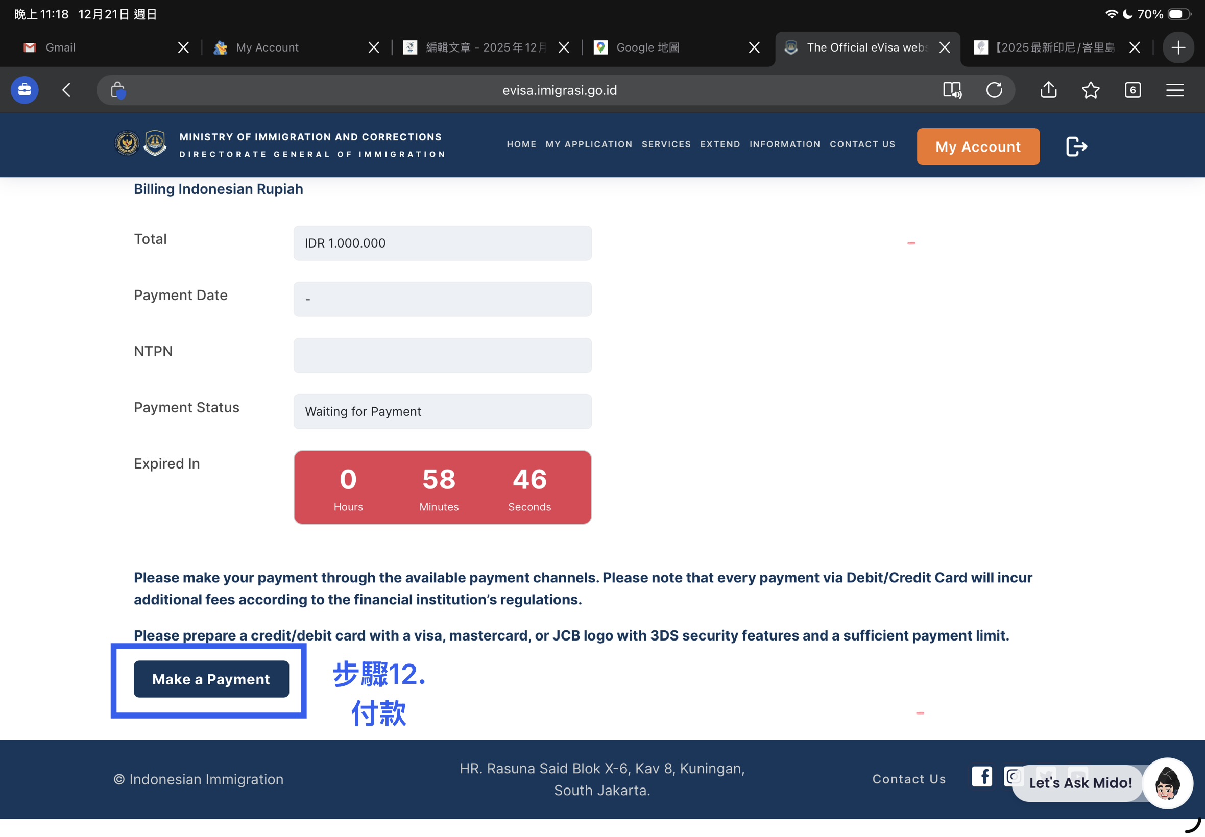 ⚠️ 簽證費為 IDR 1,000,000,但實際上會額外收取手續費,刷卡總額為 IDR 1,00,000。