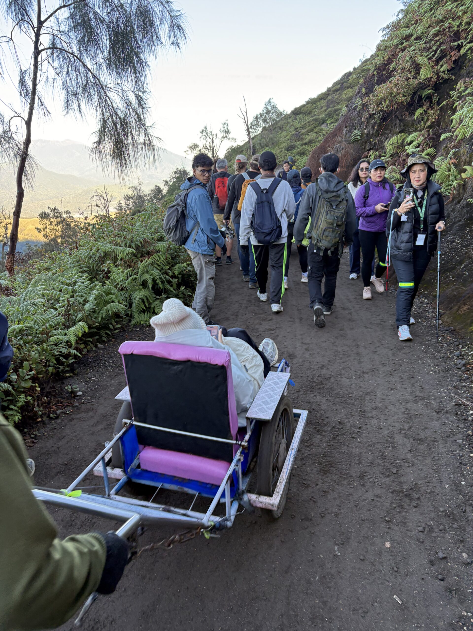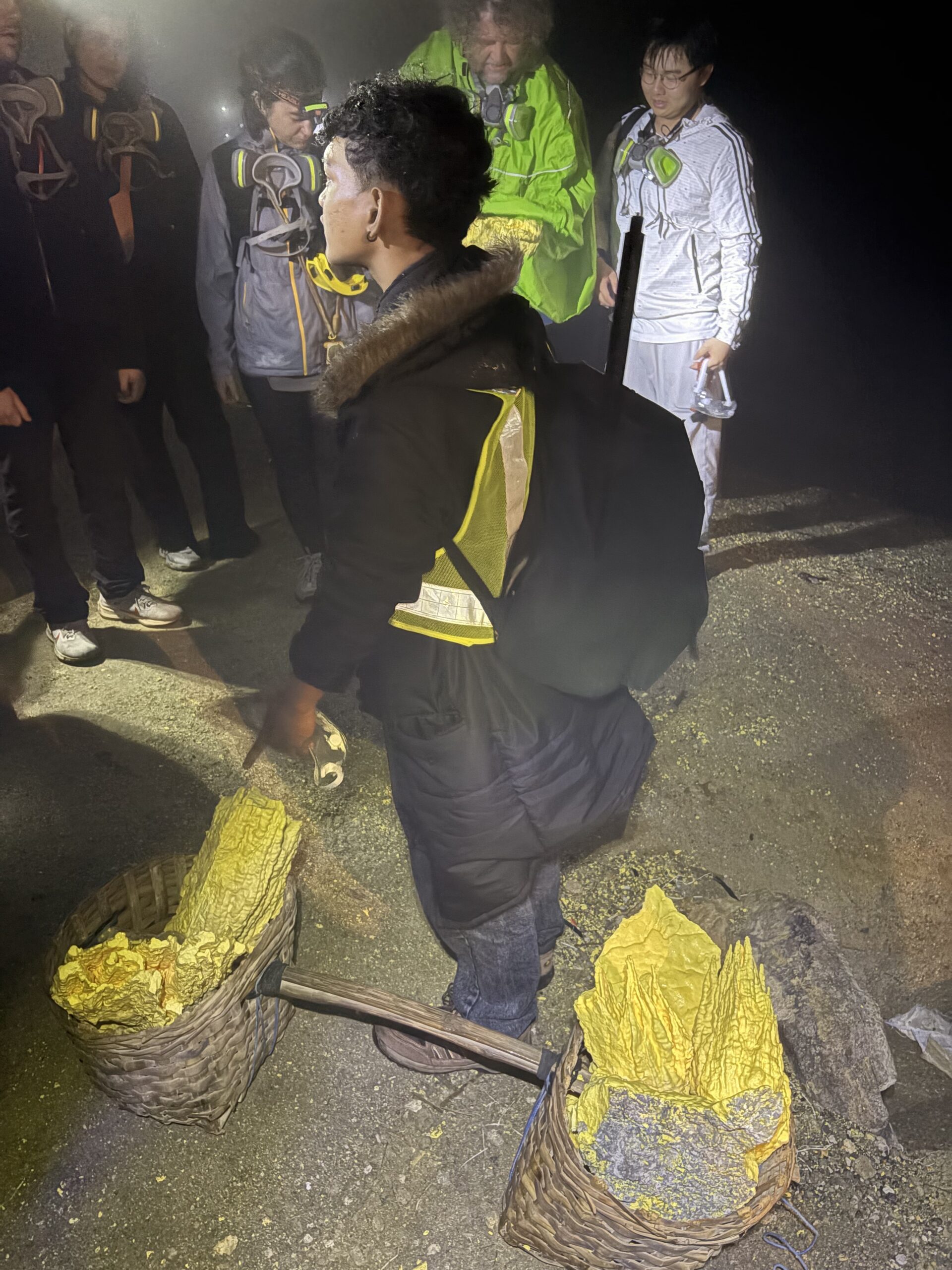 我是選擇午夜12點接,沒想到同車有一家人遲到了30分鐘才姍姍來遲,去登山口前還必須到診所取得健康檢查表(體重、血壓、有無氣喘病史)才能購票,沒想到這一家人又浪費我們20分鐘的時間 (他們感覺是在地當官的,塞錢讓小孩也能登山),02:30才來抵達登山口,初估200-300人大家全是為了「全世界唯二」能見到大規模的藍色火焰的風采,02:45起登前發放對講機以及防毒面罩與頭燈,當時下著雨我們跟著人龍往陡坡向前走,一路又飄著陣陣的煙草味,路上還要一直讓「藍寶截泥」的人力推車先過,這一路並不輕鬆喔!好險我們有租登山杖,上山與下山就能享受有它的美好!