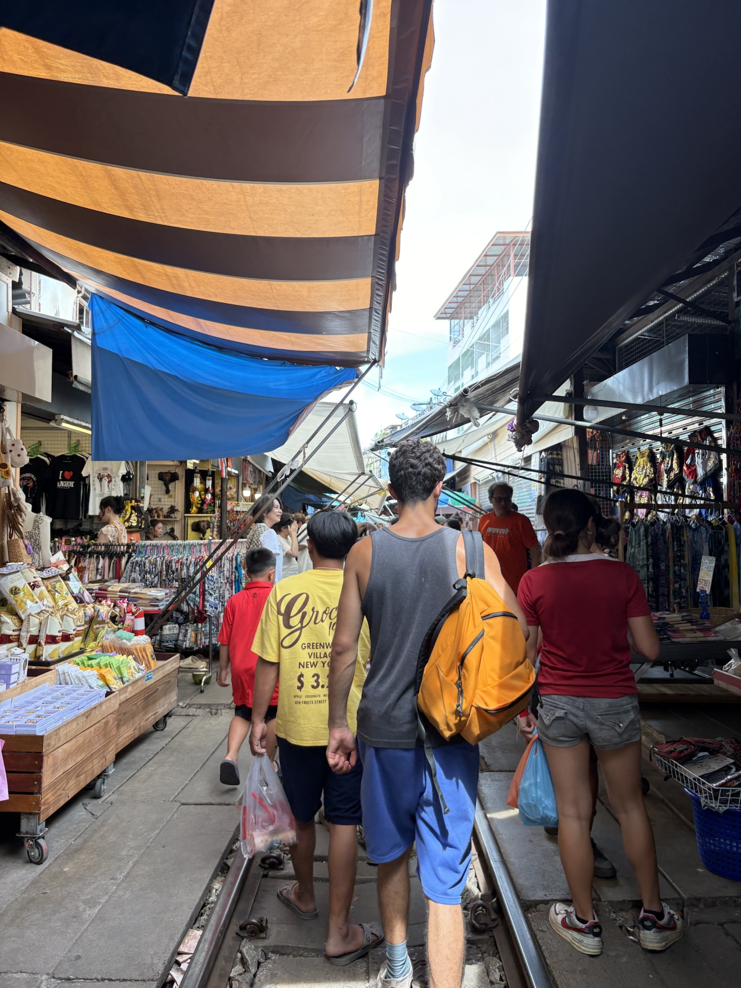 為什麼會有這樣的景象?其歷史可追溯到19世紀末,當時當地居民以販售農漁產品為生,於鐵道旁形成市集。1901年,泰國大進鐵路公司(Tachin Railway Ltd)開建鐵路,1904年通車後,市場位置剛好被鐵道劃過,攤販們不願搬離原址,反而繼續沿鐵軌兩旁擺攤,逐漸形成鐵道市場的獨特景象。
