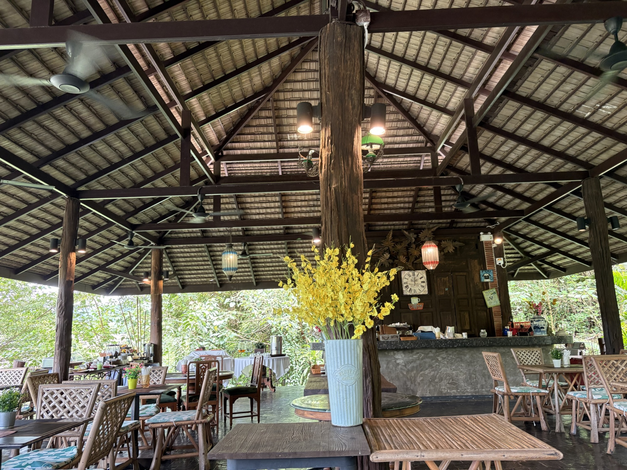 為什麼會選這家飯店?這家飯店評價兩極,好的是環境優美而且可以看著大象吃早餐,壞的是房間內的硬體設備有些破損 (例如:窗簾老舊、牆壁破損),但是還算乾淨,主要也是這間住宿很有渡假氛圍的感覺,讓我選推薦這家飯店的原因,就連在游泳時也可以看著大象活動也是一種視覺衝擊啊!飯店有附設餐廳,如果晚上不想去附近的夜市吃飯的話,也可以選擇留在飯店裡用餐,早餐有提供中式與西式套餐選擇,另外有附設自助吧餐點可以自由拿取 (麵包、自製果醬、水果、咖啡以及牛奶)非常豐盛。