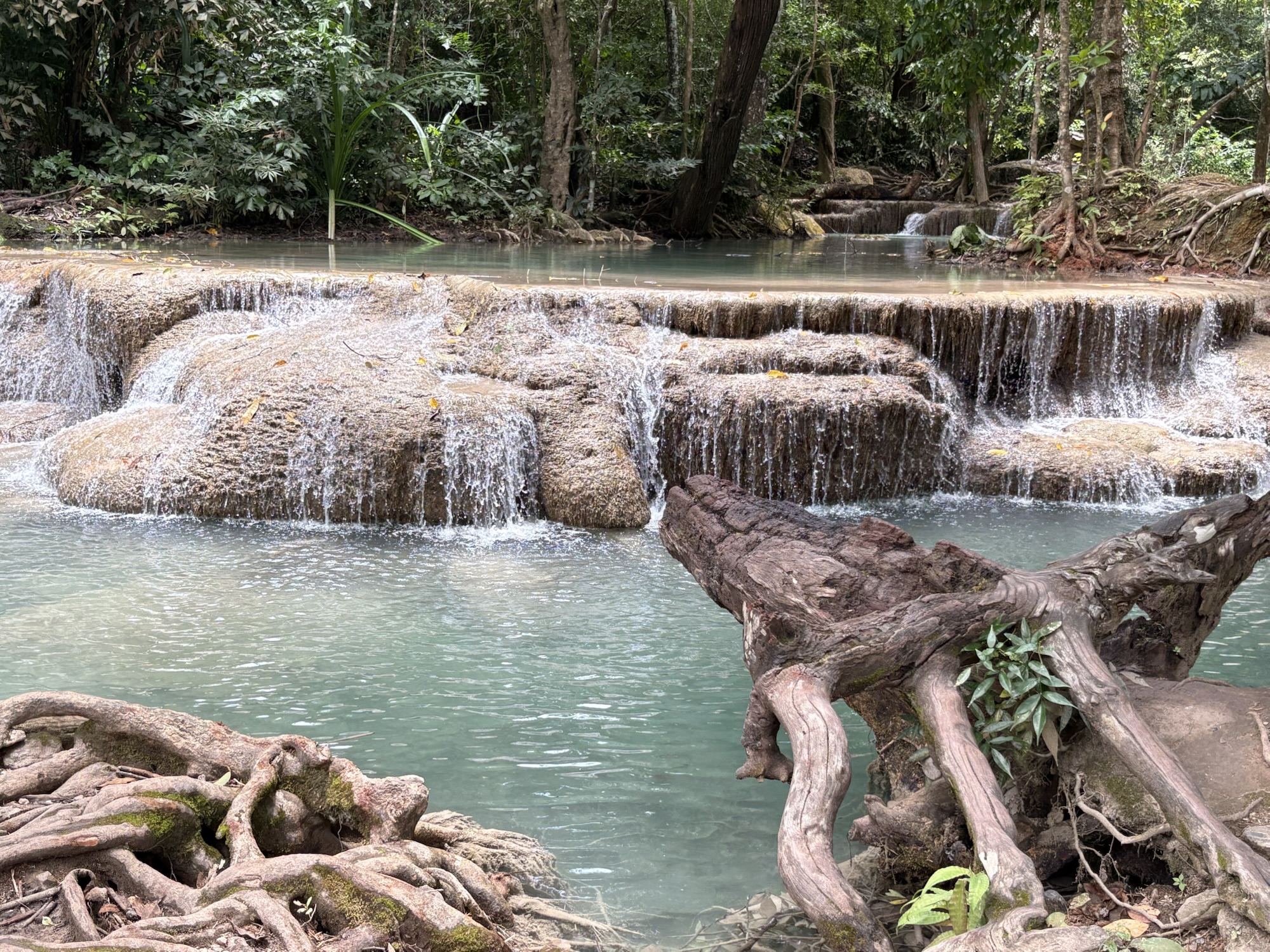 用完餐我們驅車前往約45分鐘抵達愛侶灣國家公園(Erawan National Park) 著名的「七層瀑布」。這個瀑布群名字取自印度神話中的三頭象「Erawan」,岩石在太陽角度下,竟真的像三頭象背上的寶座。
